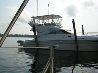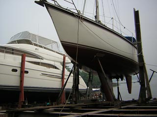 and here we are out. We look tiny compared to the million dollar boat hauled up next to us!