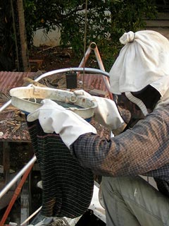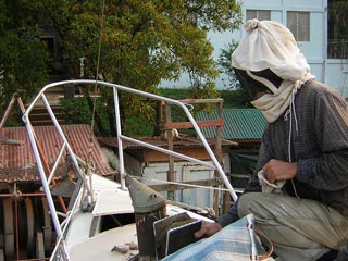 This is Stu, cracking on with the work as soon as the boat was out and sprayed down. Scrapping out all the blisters.