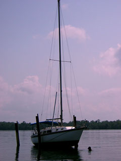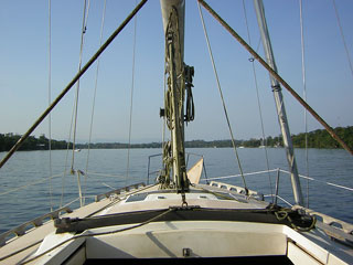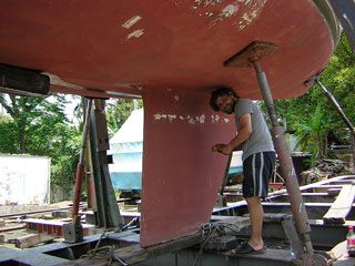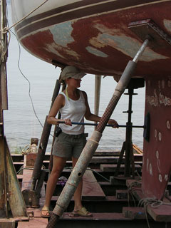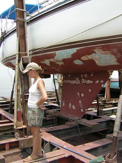 The first time the boat has moved since we have been here! This is Stu steering the boat as we motor over to Abels, the haul out place.