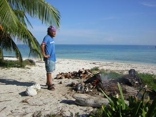 Stuart building a big fire to cook our dinner on