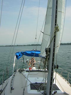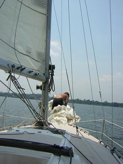 Stuart putting the foresail up in the distance
