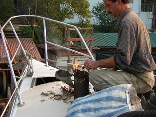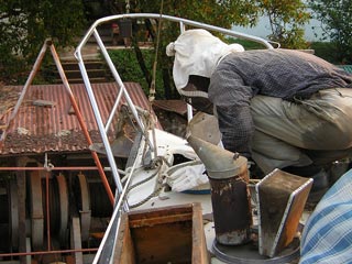 This is Stu, cracking on with the work as soon as the boat was out and sprayed down. Scrapping out all the blisters. Even I did some work!
